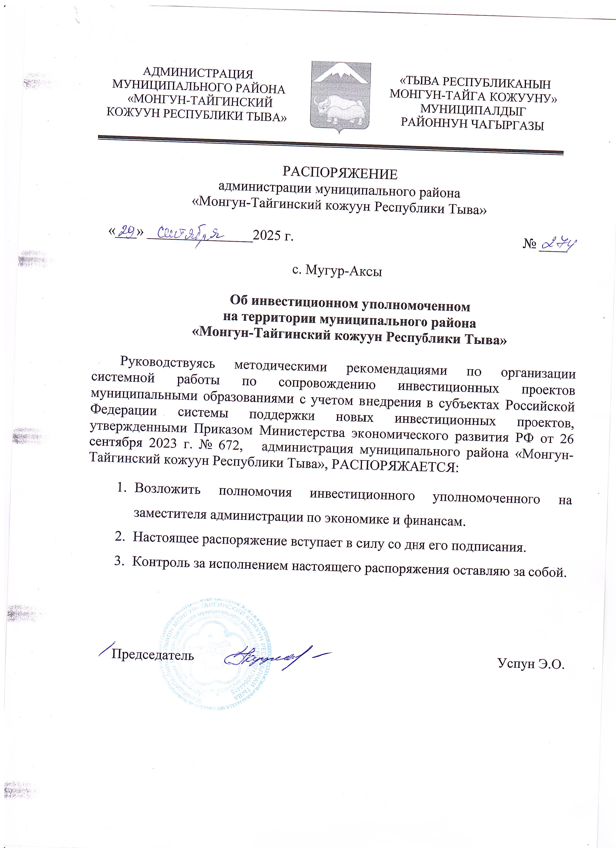 Об инвестиционном уполномоченном на территории муниципального района "Монгун-Тайгинский кожуун Республики Тыва" распоряжение от 29 сентября 2025 г. № 274
